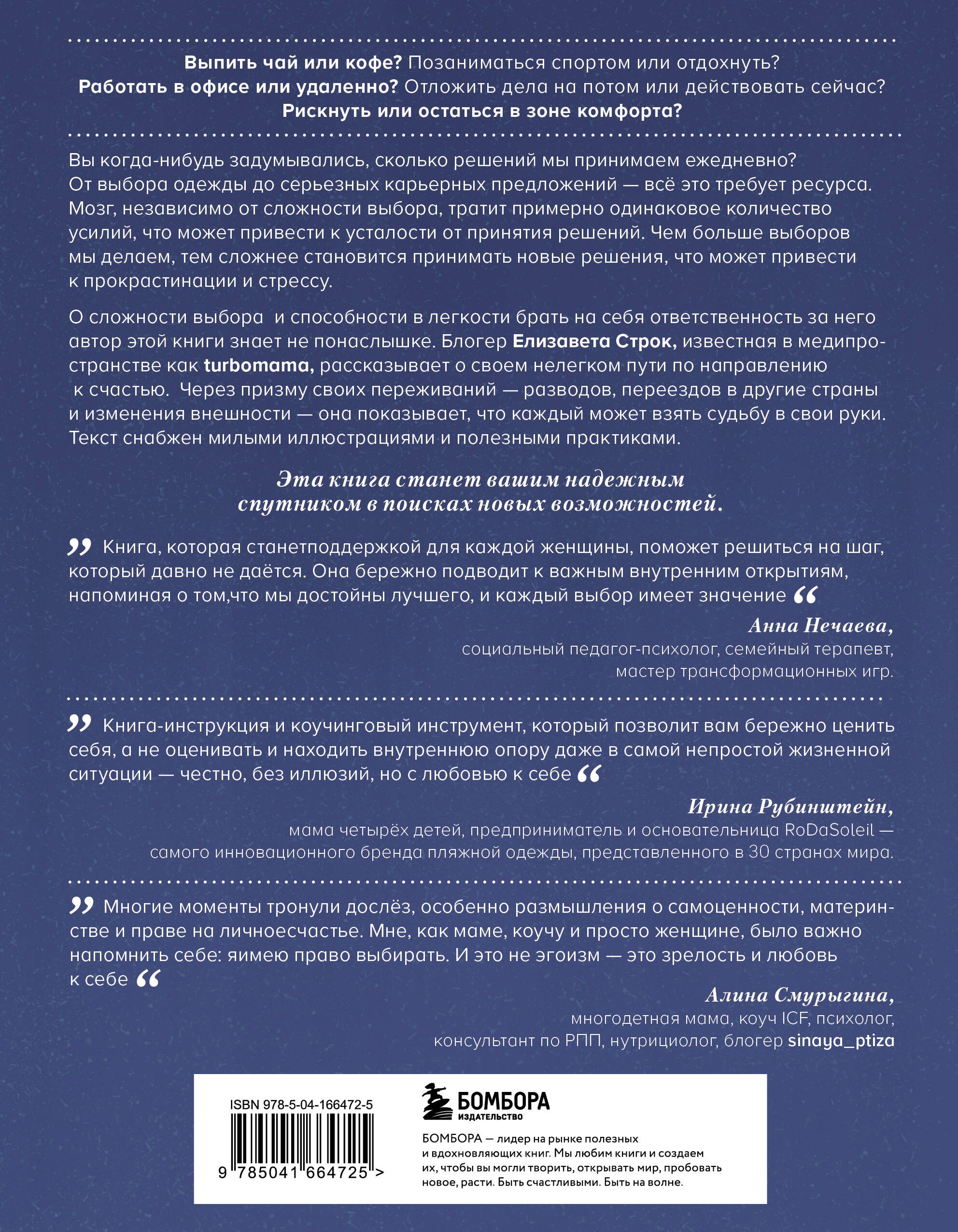 Вы когда-нибудь задумывались, сколько решений мы принимаем ежедневно? От выбора одежды до серьезных карьерных предложений — все это требует ресурса. Мозг, независимо от сложности выбора, тратит примерно одинаковое количество усилий, что может привести к усталости от принятия решений. Чем больше выборов мы делаем, тем сложнее становится принимать новые решения, что может привести к прокрастинации и стрессу.О сложности выбора и способности с легкостью брать на себя ответственность за него автор этой книги знает не понаслышке. Блогер Елизавета Строк, известная в медиапространстве как turbomama, рассказывает о своем нелегком пути по направлению к счастью. Эта книга — не просто автобиография, а настоящая путеводная звезда для тех, кто переживает трудные времена.Через призму своих переживаний — разводов, переездов в другие страны и изменения внешности — она показывает, что каждый может взять судьбу в свои руки. Текст снабжен милыми иллюстрациями и полезными практиками. Эта книга станет вашим надежным спутником в поисках новых возможностей.
