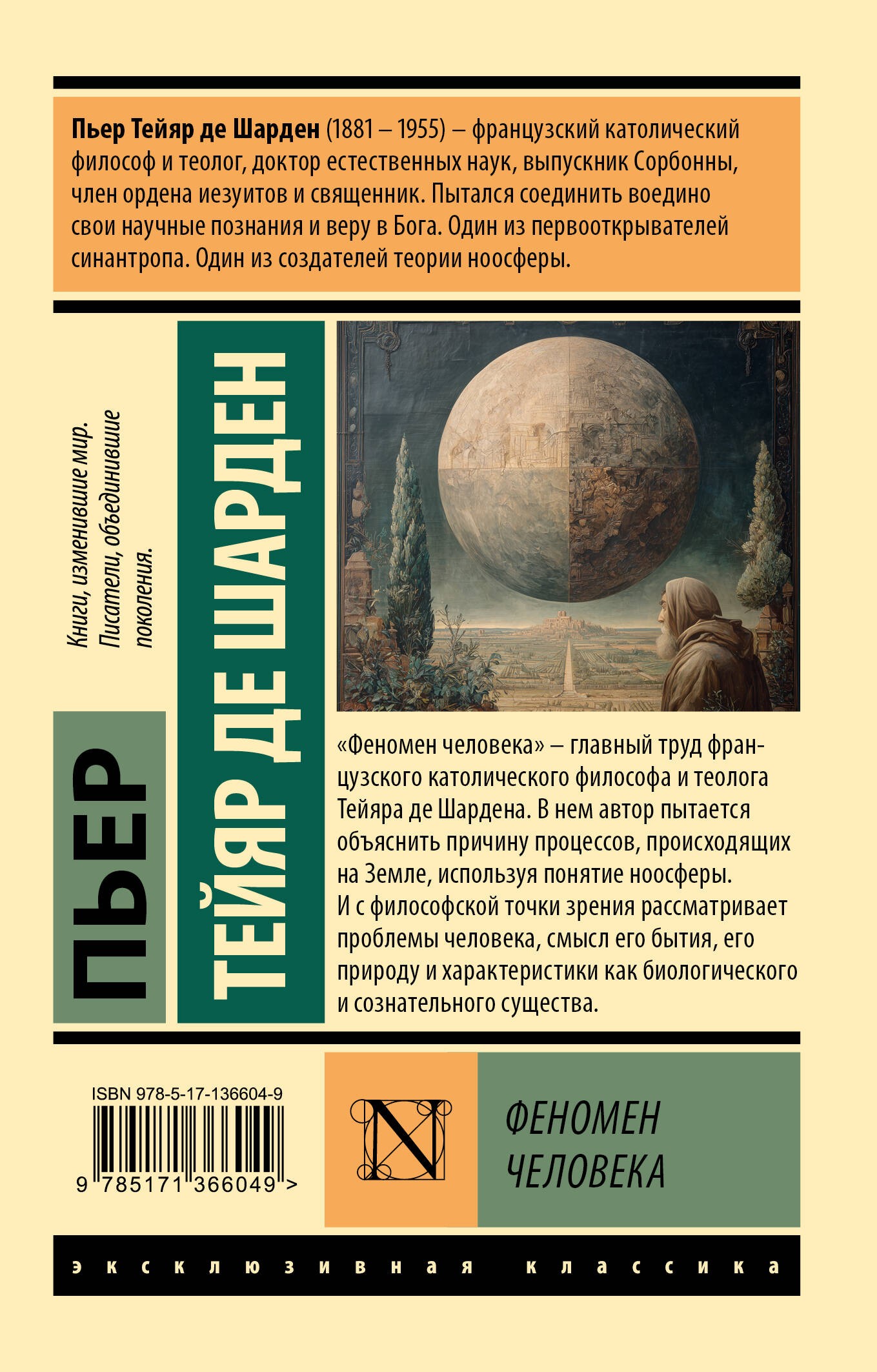 — Пьер Тейяр Де Шарден — известный французский теолог и философ, один из создателей теории ноосферы.— «Феномен человека» — главный труд Де Шардена, в нем он пытается с помощью теории ноосферы объяснить причины происходящих на Земле процессов.— Издание в серии «Эксклюзивная классика» — в удобном карманном формате и узнаваемом оформлении.