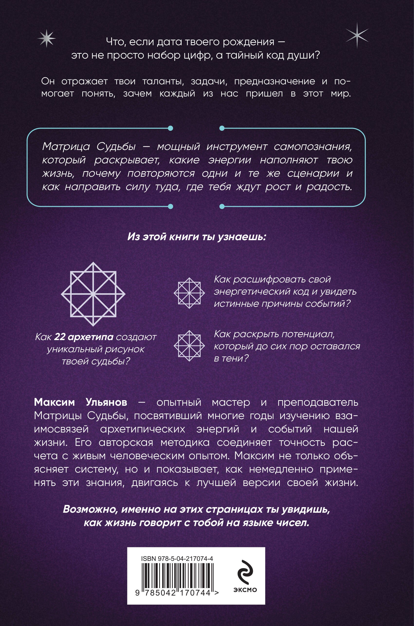 Что, если дата твоего рождения — это не просто набор цифр, а тайный код души?Он отражает твои таланты, задачи, предназначение и помогает понять, зачем каждый из нас пришел в этот мир.Матрица Судьбы — мощный инструмент самопознания, который раскрывает, какие энергии наполняют твою жизнь, почему повторяются одни и те же сценарии и как направить силу туда, где тебя ждут рост и радость.Из этой книги ты узнаешь:• Как 22 архетипа создают уникальный рисунок твоей судьбы.• Как расшифровать свой энергетический код и увидеть истинные причины событий.• Как раскрыть потенциал, который до сих пор оставался в тени.Максим Ульянов — опытный мастер и преподаватель Матрицы Судьбы, посвятивший многие годы изучению взаимосвязей между архетипическими энергиями и событиями нашей жизни. Его авторская методика соединяет точность расчета с живым человеческим опытом. Максим не только объясняет систему, но и показывает, как немедленно применять эти знания, двигаясь к лучшей версии своей жизни.Возможно, именно на этих страницах ты увидишь, как жизнь говорит с тобой на языке чисел.