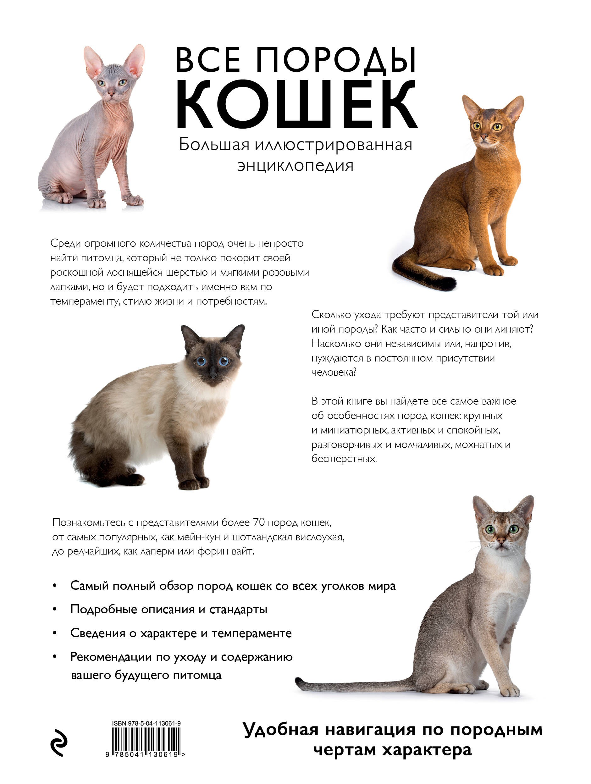 Любой котенок — милейшее создание, мимо которого сложно пройти. Но как правильно выбрать себе пушистого друга, не только по одной внешности? Ведь все породы разные, и важно подобрать питомца, который будет подходить именно вам по темпераменту, стилю жизни и потребностям.Живете один или у вас большая семья с детьми? Часто путешествуете или любите больше времени проводить дома? Хотите кота с независимым характером или, наоборот, любящего проводить как можно больше времени рядом с людьми? Сколько времени готовы уделять уходу за шерстью?В этой энциклопедии вы найдете более 70 самых разных пород кошек: крупных и миниатюрных, активных и спокойных, мохнатых и короткошерстных и познакомитесь с представителя как самых популярных пород, как мейн-кун или шотландская вислоухая, так и редчайших, как лаперм или форин вайт.- Самый полный обзор популярных пород кошек со всех уголков мира.- Подробные описания и стандарты.- Сведения о характере и темпераменте.- Рекомендации по уходу и содержанию вашего будущего питомца.