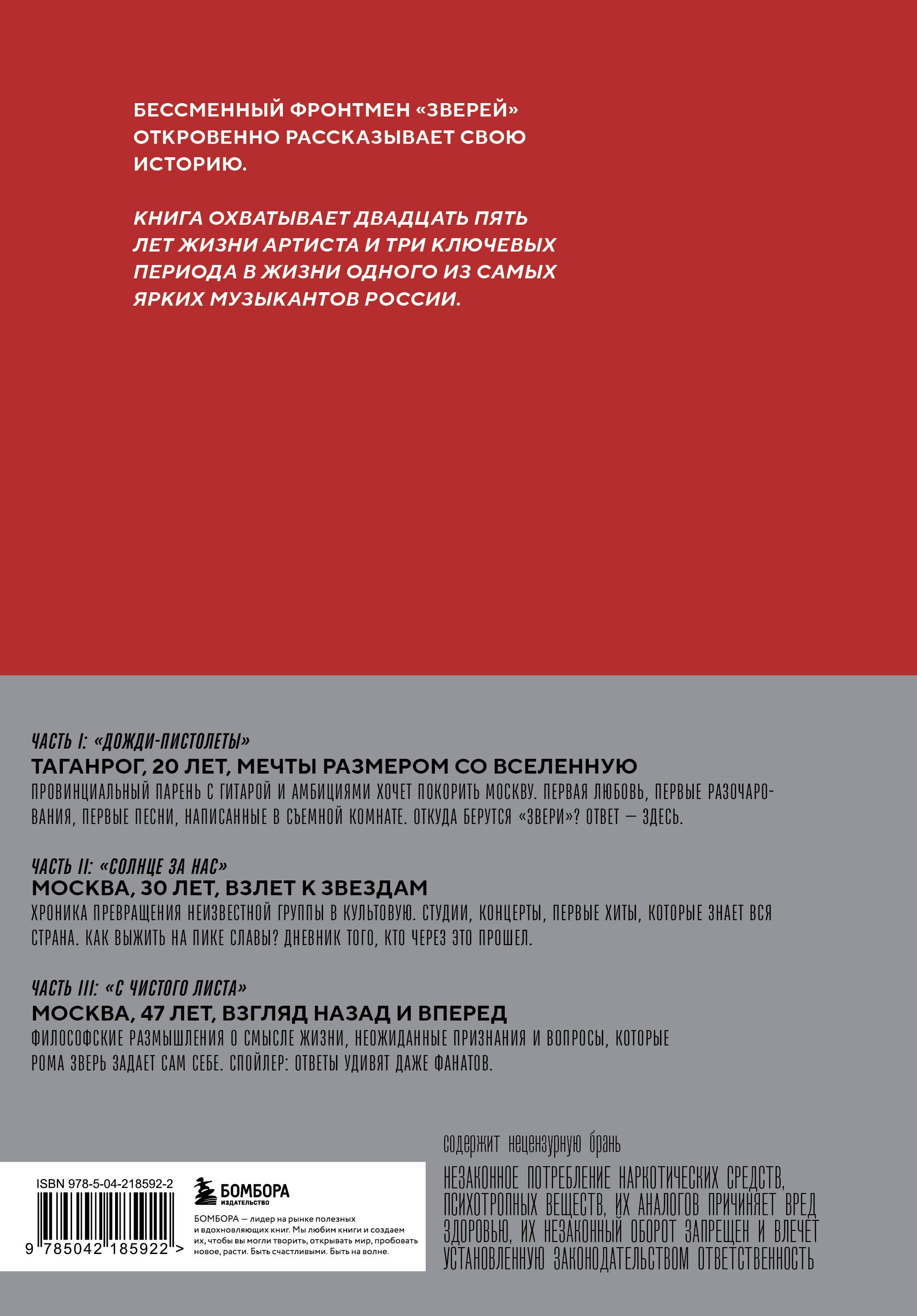 Бессменный фронтмен «Зверей» откровенно рассказывает свою историю. Книга охватывает двадцать лет жизни артиста и три ключевых эпохи: провинциального парня из Таганрога с мечтами размером со Вселенную (первая часть «Дожди-пистолеты»), хронику превращения неизвестной группы в культовую (вторая часть «Солнце за нас») и философские размышления зрелого артиста, который задает себе неожиданные вопросы (третья часть «С чистого листа»).Первые две части ранее издавались как отдельные книги, но теперь переработаны иобъединены под одной обложкой, а откровенный рассказ впервые дополняетфотоколлекция: от семейных архивных снимков до эксклюзивных кадров с закулисья масштабных концертов.Три жизни в одной книге. Уникальность издания в том, что его можно читать с любой части, в любом порядке — каждая история самодостаточна, но вместе они создают полную картину.Для кого эта книга?- Поклонников и фанатов «Зверей» — узнаете о группе еще больше.- Артистов, находящихся в начале пути, — история, полная вдохновения и стремления.- Любителей честных биографий — без прикрас и художественного вымысла.- Всех, кому за 30, — видоизменяются ли мечты и ценности.