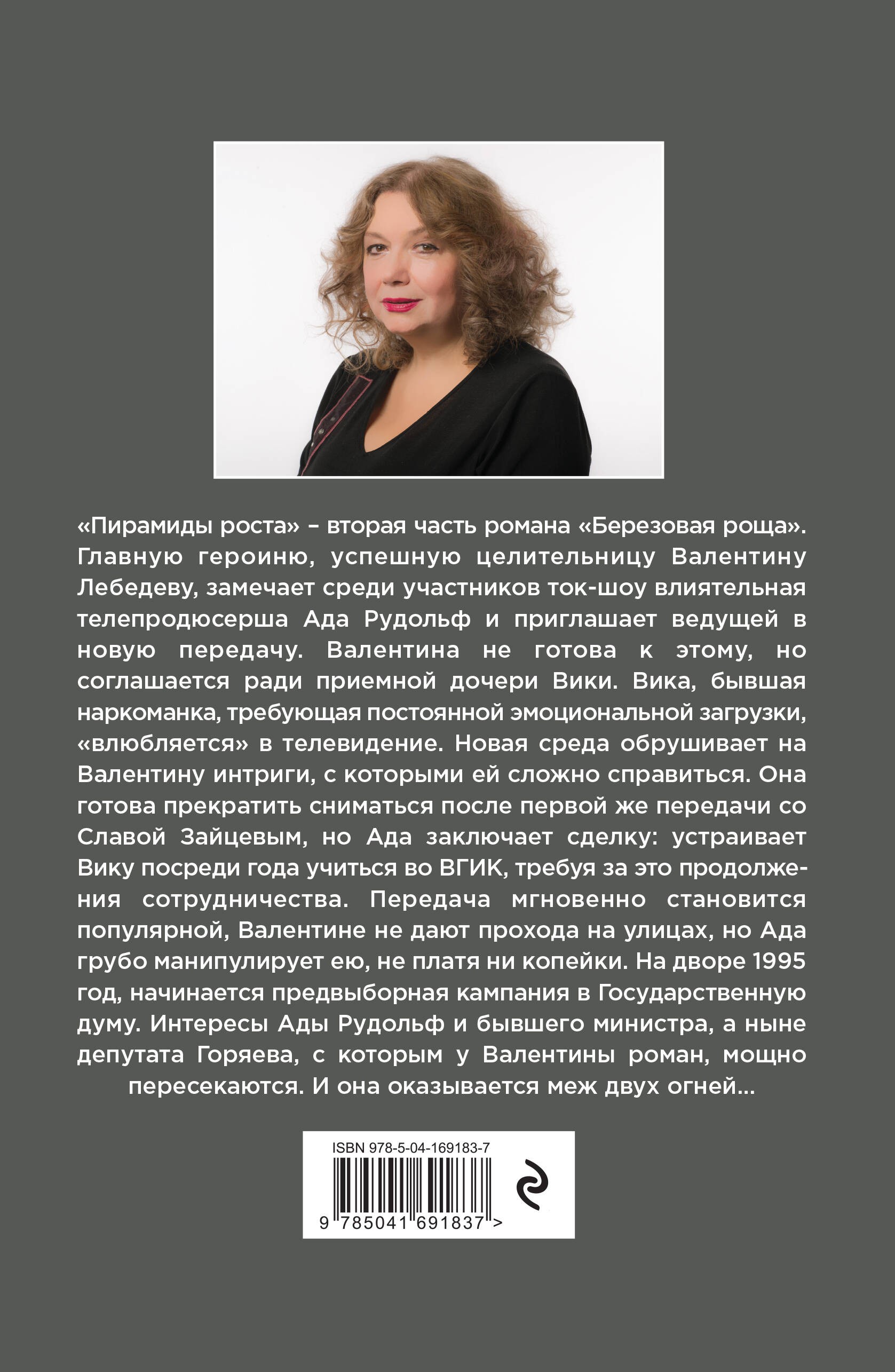 «Пирамиды роста» — вторая часть романа «Берёзовая роща». Главную героиню, успешную целительницу Валентину Лебедеву, замечает среди участников ток-шоу влиятельная телепродюсерша Ада Рудольф и приглашает ведущей в новую передачу. Валентина не готова к этому, но соглашается ради приёмной дочери Вики. Вика, бывшая наркоманка, требующая постоянной эмоциональной загрузки, «влюбляется» в телевидение. Новая среда обрушивает на Валентину интриги, с которыми ей сложно справиться. Она готова прекратить сниматься после первой же передачи со Славой Зайцевым, но Ада заключает сделку: устраивает Вику посреди года учиться во ВГИК, требуя за это продолжения сотрудничества. Передача мгновенно становится популярной, Валентине не дают прохода на улицах, но Ада грубо манипулирует ею, не платя ни копейки. На дворе 1995 год, начинается предвыборная кампания в Государственную думу. Интересы Ады Рудольф и бывшего министра, а ныне депутата Горяева, с которым у Валентины роман, мощно пересекаются. И она оказывается меж двух огней…