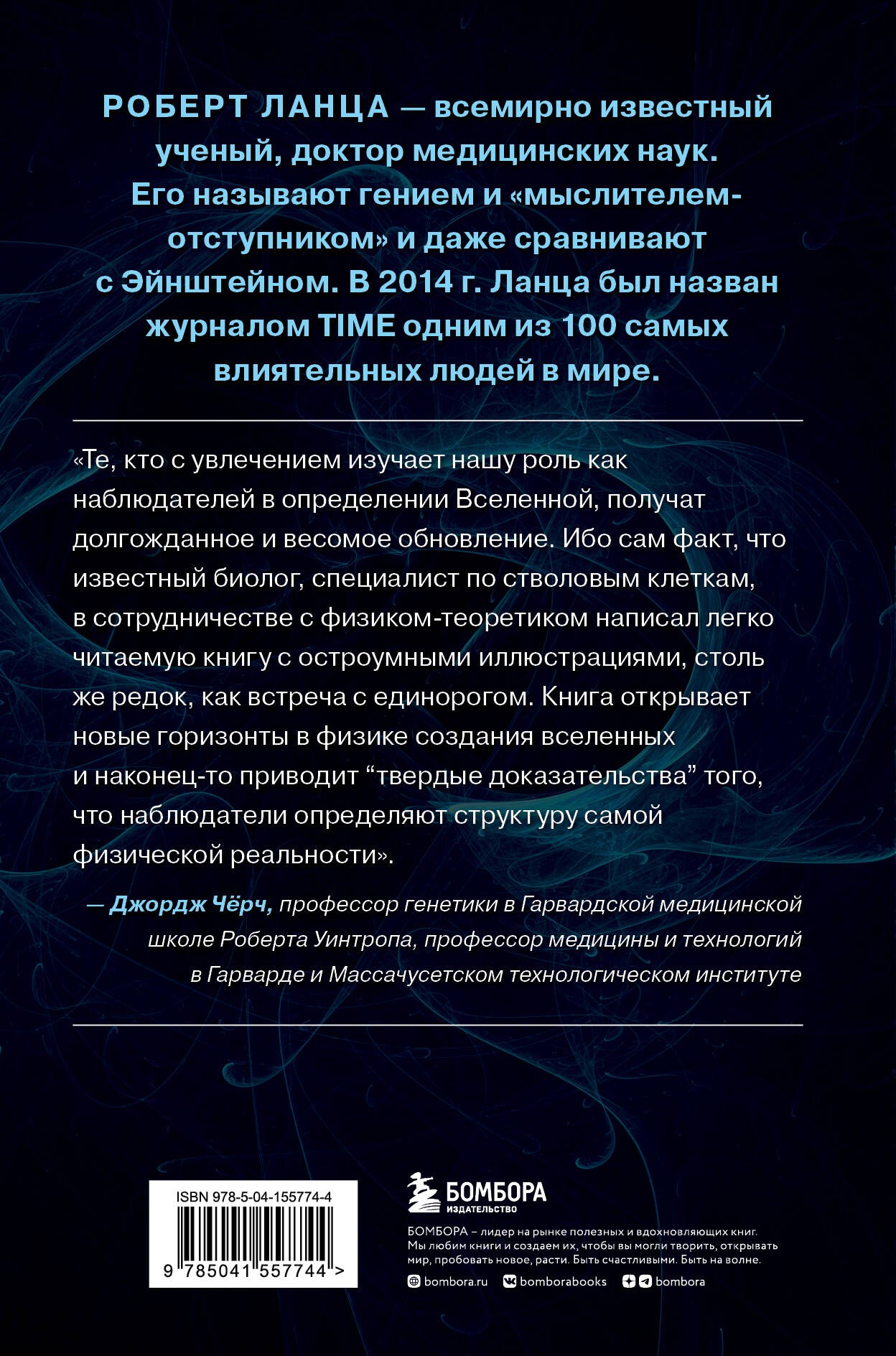 «Те, кто с увлечением изучают нашу роль как наблюдателей в определении Вселенной, получат долгожданное и весомое обновление. Ибо сам факт, что известный биолог, специалист по стволовым клеткам, в сотрудничестве с физиком-теоретиком написал связную, свежую и легко читаемую книгу с остроумными иллюстрациями, — столь же редок, как встреча с единорогом. “Биоцентризм. Великий дизайн” открывает новые горизонты в физике создания вселенных и наконец-то приводит “твердые доказательства” того, что наблюдатели определяют структуру самой физической реальности». — Джордж Черч, профессор генетики в Гарвардской медицинской школе Роберта Уинтропа, профессор медицины и технологий в Гарварде и Массачусетском технологическом институте«“Биоцентризм. Великий дизайн” с блеском обращает наше внимание на наиболее важную особенность всей нашей Вселенной — а именно на человеческий разум. Роберт Ланца с большим знанием и красноречиво анализирует ту степень проникновения, которую человеческий разум постиг в понимании математического аппарата, лежащего в основе этой Вселенной, раскрывая его глубинный и чисто ментальный характер. По сути, именно микроскопическое исследование этого внешнего мира физиками наиболее ярко раскрывает “великий дизайн” Вселенной. Новая книга повествует о реальной природе Вселенной: все мы ради полного постижения должны докопаться до самой сути».