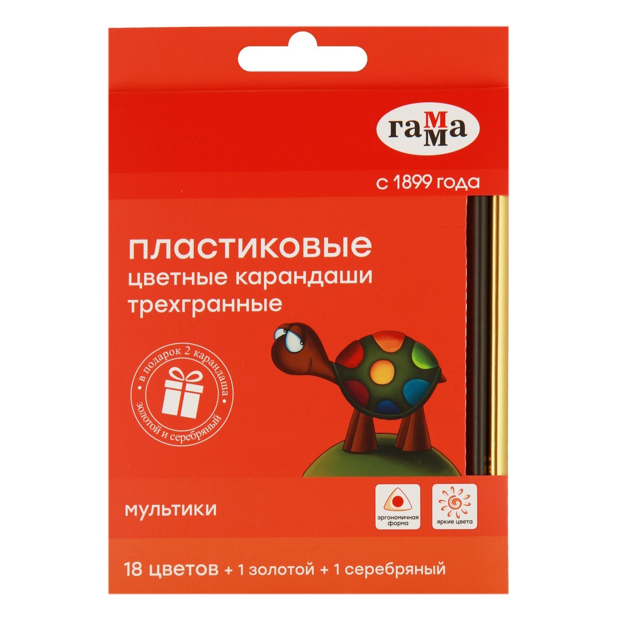 • Цветные пластиковые карандаши ГАММА серии "Мультики" выполнены в эргономичном трехгранном корпусе, который подскажет ребенку, как правильно держать карандаш во время творческих занятий. В наборе 18 цветов. Также в подарок идет 2 карандаша: серебряный и золотой. Проклеенный ударопрочный грифель диаметром 3 мм не крошится во время заточки и не ломается даже после падения. Корпус карандаша длиной 174 мм изготовлен из высококачественного пластика. За яркость и высокую укрывистость отвечают качественные пигменты в составе. Ребенку не придется сильно давить на карандаш – рисунок получится ярким и равномерно закрашенным. Упаковка – картонная коробка с европодвесом. - Количество цветов: 20, - Форма корпуса: трехгранная, - Заточка грифеля: да. - Количество карандашей: 20 Количество в наборе: 18; Вид карандаша: Цветной; Форма карандаша: Трехгранный;