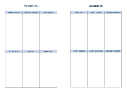 Ежедневник недатированный, 256 страниц, формат А5, твердый переплет, плотность 65 гр/м2. Внутренний блок - высококачественная офсетная белая бумага. Информационно-справочный блок включает календарь, международные и внутрироссийские телефонные коды, размеры одежды, праздничные даты. Почасовая разбивка дня для максимально точного планирования. День и месяц проставляется вручную. Строгая архитектура, печать в одну краску - голубым цветом. Обложка - 7БЦ, полноцветная печать с глянцевой ламинацией.