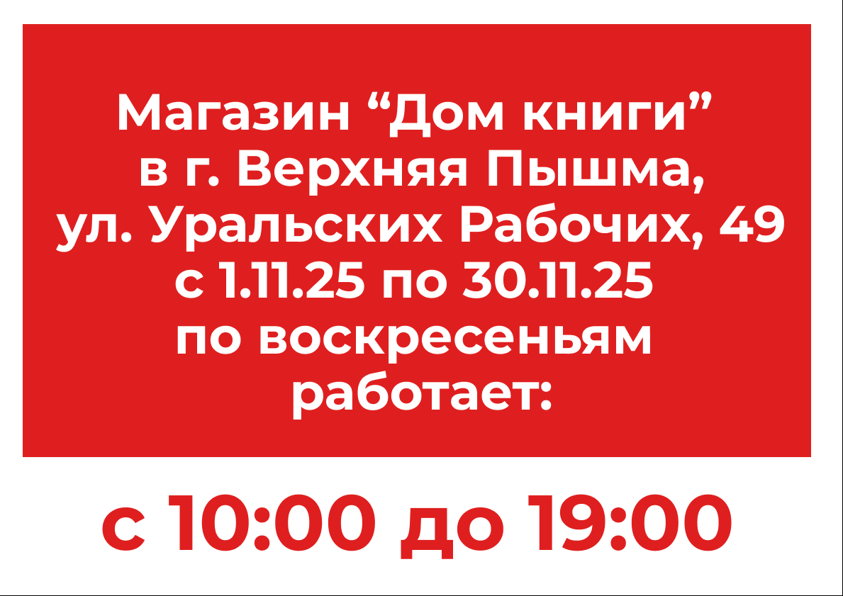 Уважаемые покупатели, магазин "Дом Книги" по адресу г. Верхняя Пышма, ул. Уральских рабочих, 49 с 1 по 30 ноября по воскресеньям работает с 10:00 до 19:00!