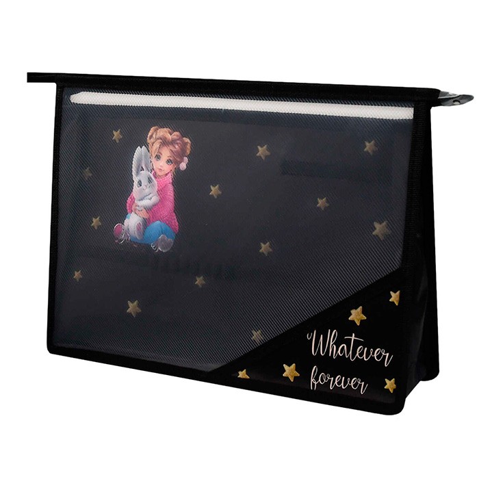 Папка для школьных тетрадей. ДЕВОЧКА И ЗАЙКА. Формат А4. Размер: 33x23 см. Материал: полипропилен. Толщина: 500 мкм. Количество отделений - 1 отделение (-я). Тип застёжки: молния. Отделка: УФ-печать. Цвет: чёрный, розовый. Особенности: внутренний разделитель с эластичными держателями для канцелярских принадлежностей.